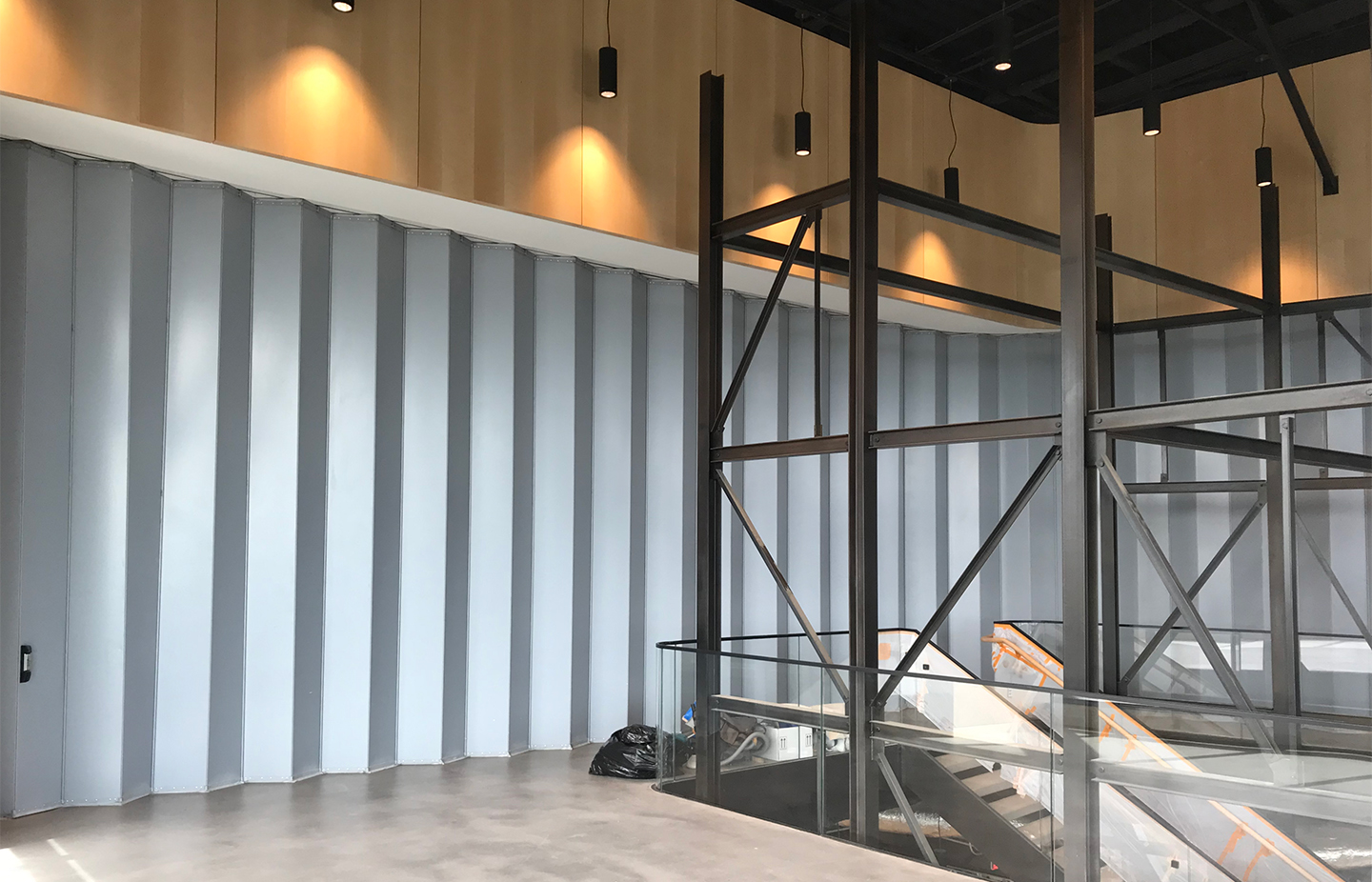 McKEON AC8814-CP radius compact pocket accordion fire doors maximized the openness of the stairway while minimizing side storage requirements. One of the two curved accordions measures an impressive 67 feet in length and over 14 feet in height, the other 47 feet in length and 10 feet in height!