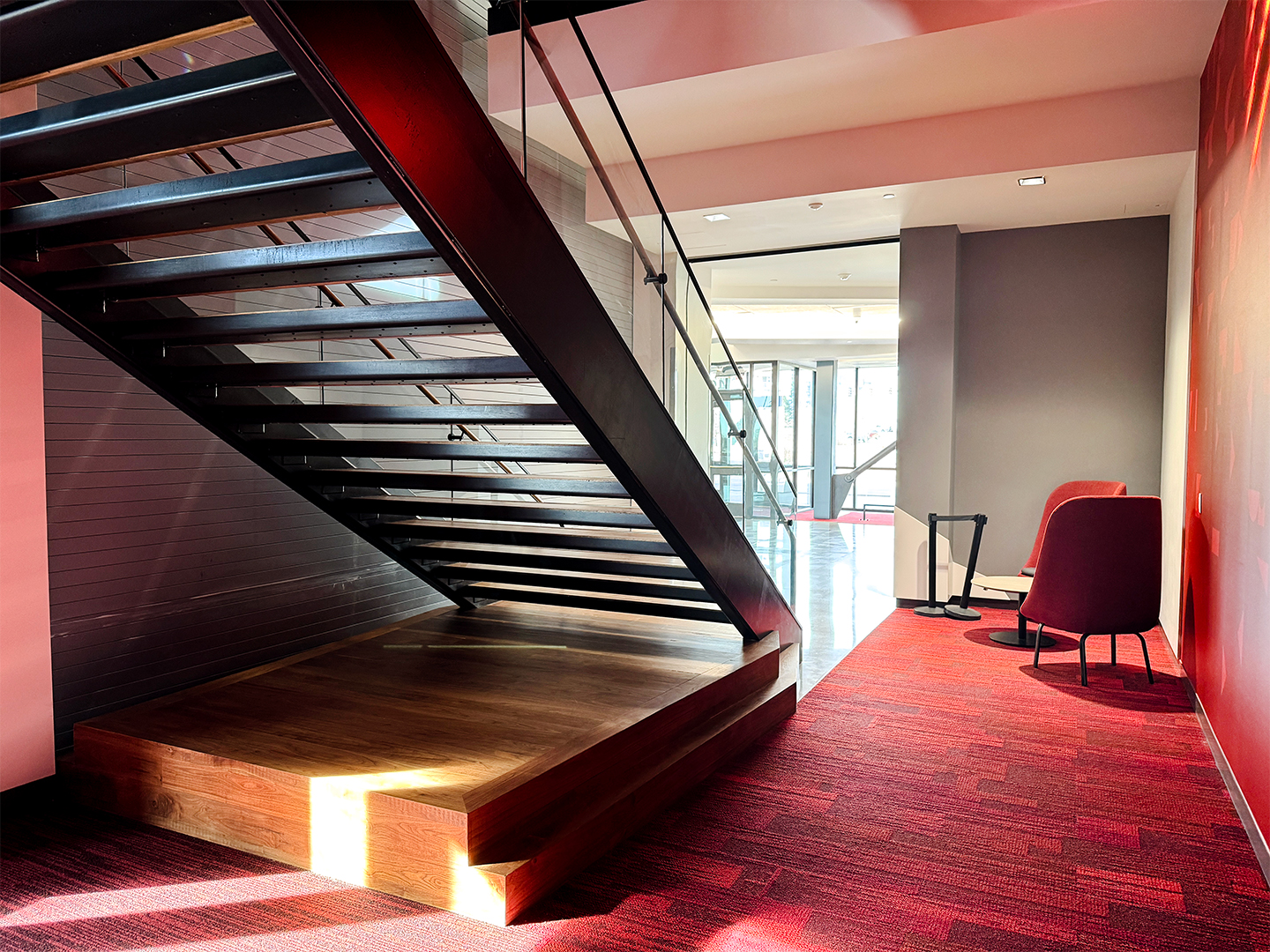 The design team’s vision included a three-story interior exit stairway that also served as a monumental stairway leading to an auditorium that opens into a light-filled  vertical space. Due to the need maintain life safety of the building occupants in the open gathering space, specialized solutions were essential.