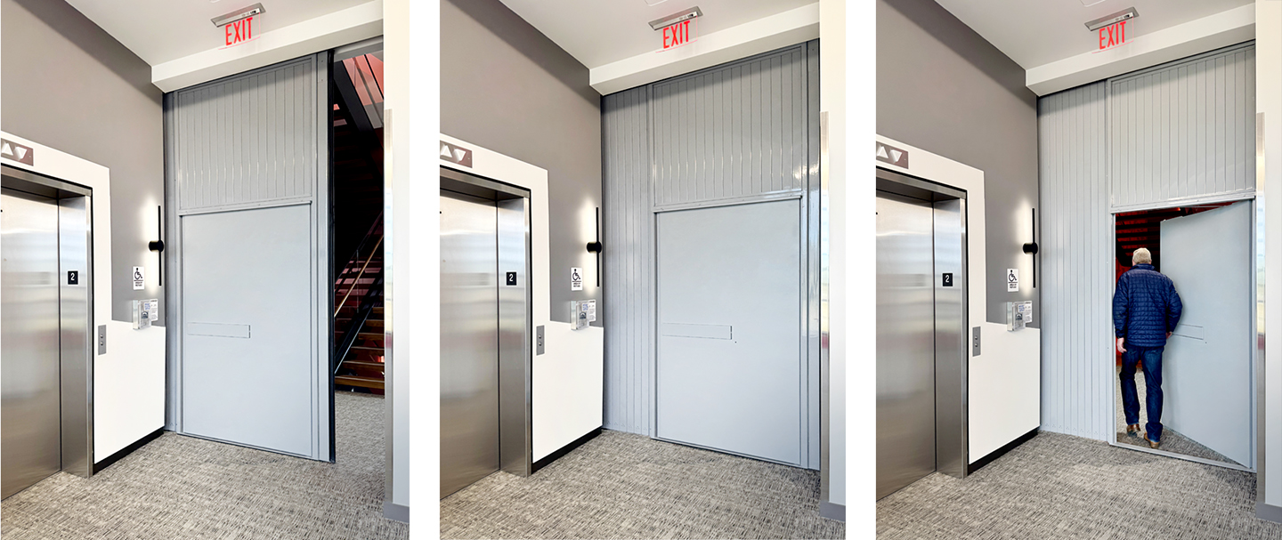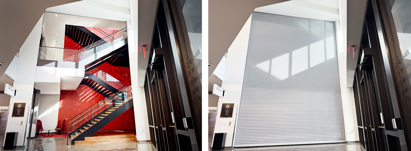 That’s where Powers Products stepped in. Working closely with HCM, the team identified the right fire and smoke rated wide-span opening protectives to ensure safety while maintaining the architectural design. The solution incorporated McKEON’s Auto-Set® FSFD-M-G galvanized steel fire rated shutter, paired with a side acting, fire rated Safescape® S7700-G with egress.
